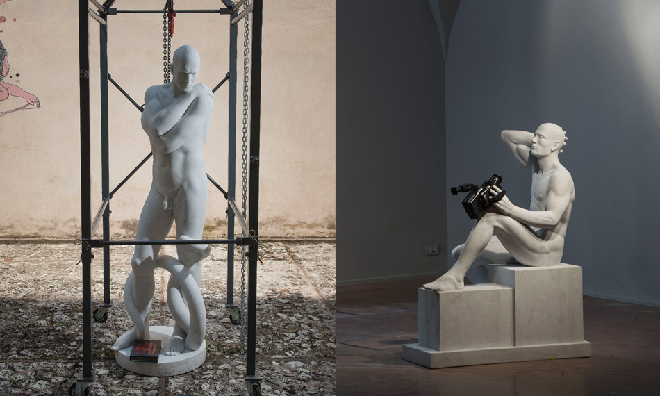 Spoleto mantiene salda la sua attenzione verso la scultura contemporanea, con un occhio particolare alla memoria dei materiali nobili e al loro cortocircuito nelle strutture dinamiche del presente. Giuliano Corelli (Condino, 1971) è un artista anomalo e raffinato, privo di foga espositiva, concentrato a lavorare nel suo studio dal 2007, anno in cui si è trasferito in Toscana e ha iniziato a scolpire il marmo. Da quel giorno sono nate nove grandi sculture col tipico bianco di Carrara, tutte in scala naturale, nove posizioni di vita quotidiana dei suoi uomini urbani dai lineamenti contemporanei e catalizzanti.